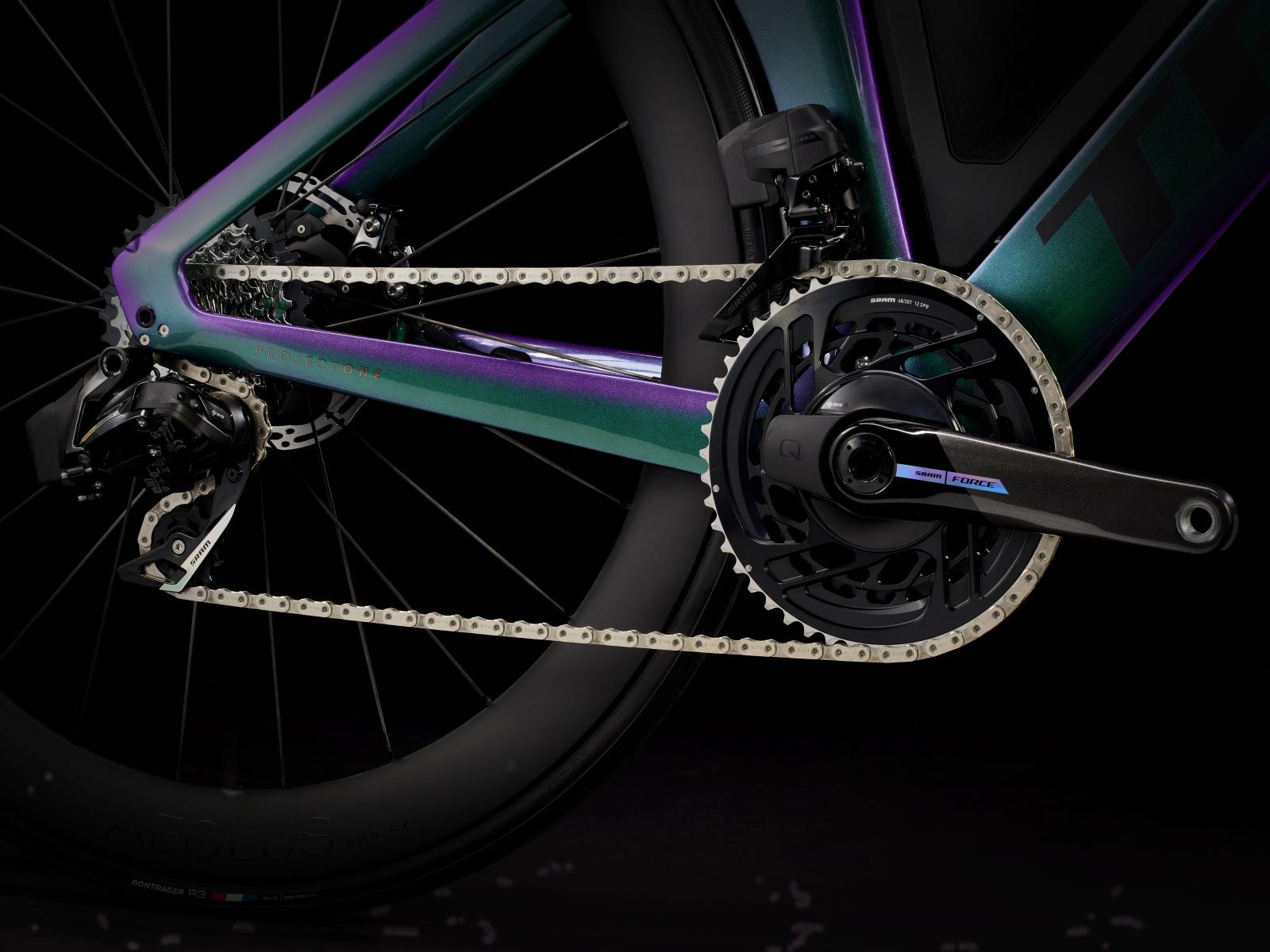 Einen ultraleichten Rahmen aus 800 Series OCLV Carbon, windschnittige Rohre mit Kammtail Virtual Foil-Profil (KVF), eine Speed Concept-Carbongabel mit aerodynamischem Profil, vibrationsdämpfendes IsoSpeed, integrierte Aufbewahrungslösungen für Verpflegung, Flüssigkeit und Pannenkit, einen drahtlosen, elektronischen SRAM Force AXS D2 12fach-Antrieb mit SRAM AXS Clics-Schalthebeln, einen SRAM Force AXS-Powermeter, einen vollständig integrierten Lenker samt Vorbau, einen triathlonspezifischen Bontrager Hilo Comp-Sattel für eine aggressive Aero-Sitzposition, Scheibenbremsen für zuverlässige Bremsleistung und Bontrager Aeolus Pro 51-
