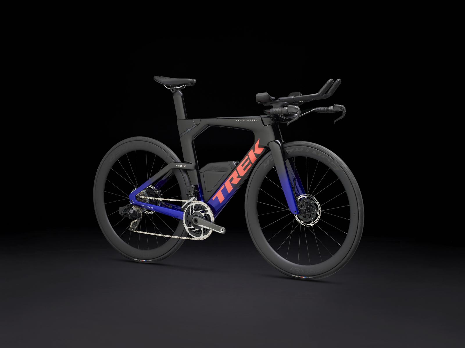 Einen ultraleichten Rahmen aus 800 Series OCLV Carbon, windschnittige Rohre mit Kammtail Virtual Foil Profil (KVF), eine Speed Concept Carbongabel mit aerodynamischem Profil, straßenglättendes IsoSpeed, integrierte Aufbewahrungslösungen für Verpflegung, Flüssigkeitsversorgung und Pannenkit, einen drahtlosen, elektronischen SRAM RED AXS 12fach-Antrieb der vorherigen Generation mit SRAM AXS Blips Schalthebeln, ein SRAM RED AXS Powermeter, eine integrierte Lenker/Vorbau-Einheit, einen triathlonspezifischen Bontrager Hilo Pro Carbonsattel, zuverlässige Scheibenbremsen und aerodynamische Bontrager Aeolus Pro 51 Laufräder aus OCLV Car
