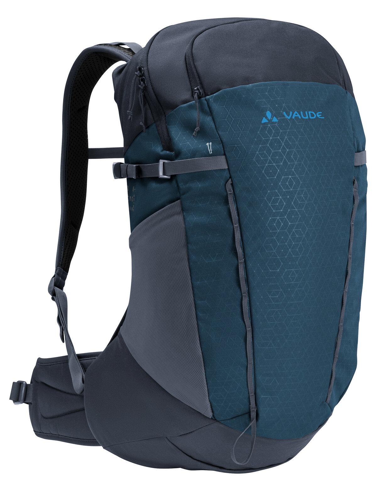 Eine große Stärke des Agile Air 26 l Wanderrucksacks zeigt sich an heißen Sommertagen: Das hinterlüftete Tragesystem Aeroflex 3D schafft einen nach drei Seiten offenen Raum zwischen Packsack und Rücken. So kann die Luft zu allen Seiten zirkulieren und der Wärmestau wird signifikant reduziert. Die Ausstattung lässt auf Tageswanderungen und im Alltag keine Wünsche offen: ein gepolstertes Fach für Sonnenbrille und Smartphone ist genauso an Bord wie eine elastische Netztasche an der Seite und eine Halterung für Trekkingstöcke. Mit 26 l Volumen bietet der Wanderrucksack jede Menge Platz für Regen- und Wechselkleidung, Snacks und Wasser sowie Kleinteile wie Geldbörse, GPS & Co. An zwei Gurtbändern mit Schlaufen lässt sich weitere Ausrüstung befestigen. Die Ergoshape-Schultergurte sitzen bequem ohne einzuengen, während der Hüftgurt für eine stabile Lastübertragung sorgt. Das VAUDE Green Shape-Label steht für ein umweltfreundliches, funktionelles Produkt aus nachhaltigen und bluesign® zertifizierten Materialien.