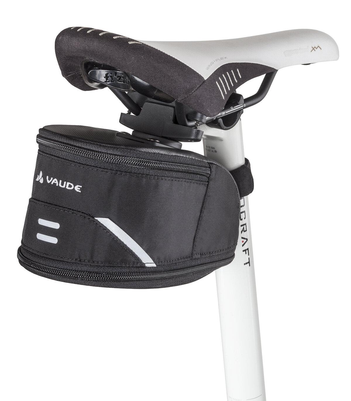 Umweltfreundliches Multitalent. Die funktionelle Satteltasche aus bluesign®-zertifiziertem Material wird per Twist-Adapter befestigt und kann bei Bedarf im Volumen erweitert werden. Sie bietet Stauraum für Ersatzschlauch, Werkzeug und Montierhebel bis hin zu Wetterjacke, Energieriegel und Not-Groschen. Das VAUDE Green Shape-Label steht für ein umweltfreundliches, funktionelles Produkt aus nachhaltigen Materialien.